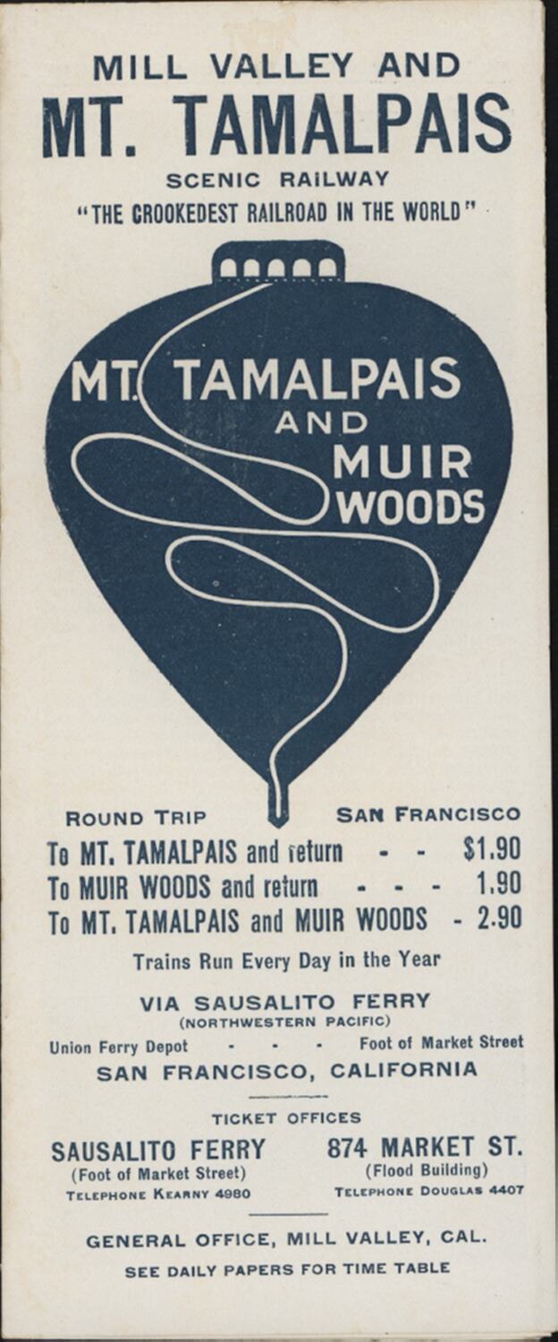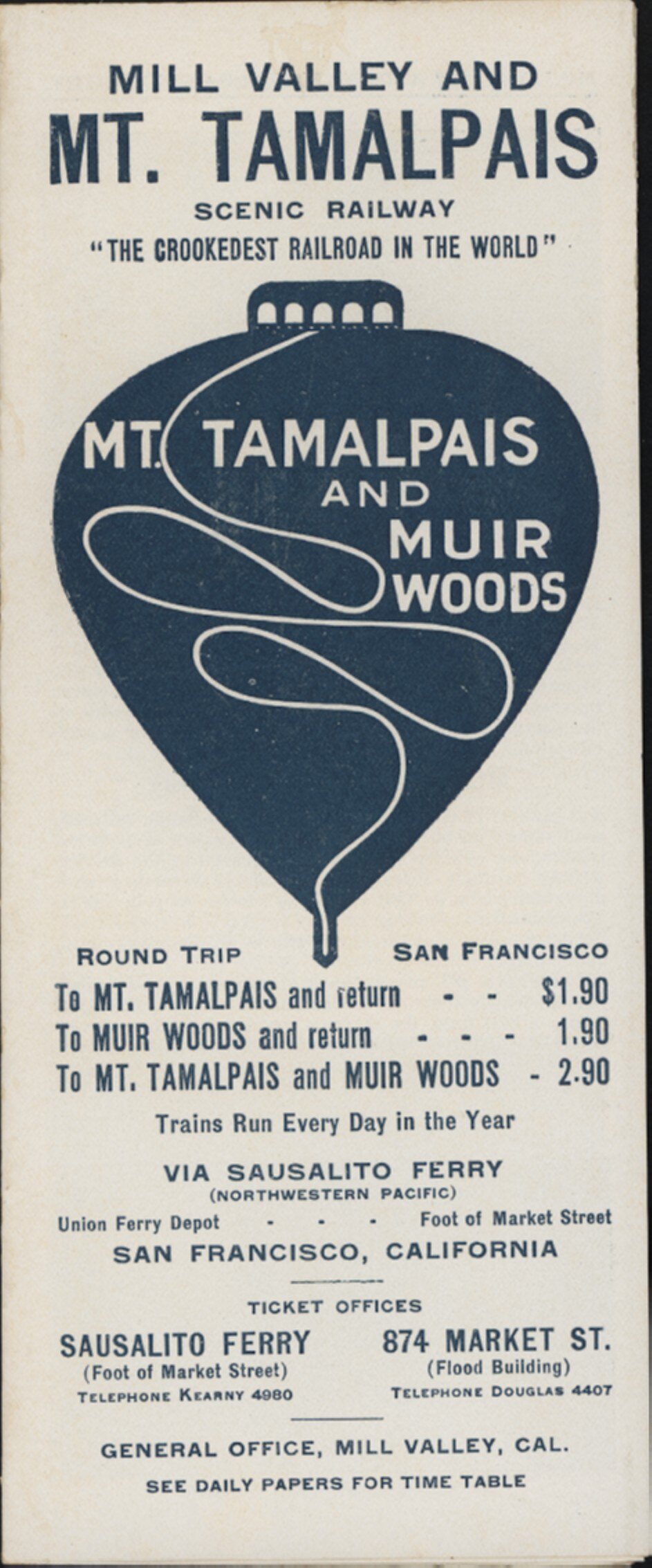 'Mill Valley and Mt. Tamalpais Scenic Railway' is a leaflet issued by Mt. Tamalpais and Muir Woods Railway in Mill Valley, California, U.S.A in 1911. The leaflet provides travel information about Mt. Tamalpais and Muir Woods and the scenic railway, claimed to be 'The Crookedest Railroad in the World'.
