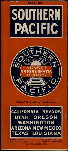 'Southern Pacific, Sunset Ogden & Shasta Routes' is a railway timetable issued by Southern Pacific in San Francisco, California, U.S.A. in May 1911. It details the time tables for the Ogden and Shasta routes which travelled through California, Nevada, Utah, Oregon, Washington, Arizona, New Mexico, Texas and Louisiana. This is a duplicate of HT 24322.