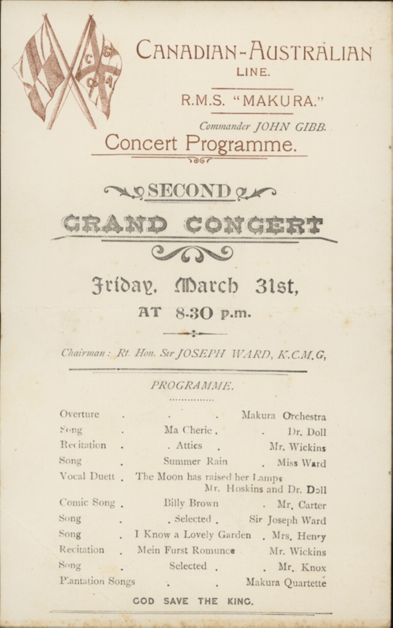 Text: CANADIAN-AUSTRALIAN / LINE / R.M.S. "MAKURA" / Commander JOHN GIBB / Concert Programme / SECOND / GRAND CONCERT / Friday, March 31st / AT 8.30p.m.