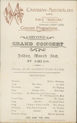 'Canadian-Australian Line, R.M.S. 'Makura", Concert Programme' is the programme to the Second Grand Concert of Friday, 31 March 1911 that took place on the R.M.S. Makura as it travelled from Sydney, Australia to Vancouver, Canada in March and April of 1911. As well as the Makura Orchetra, the concert featured ship passengers who performed various songs and recitations.