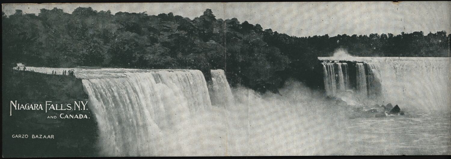 'Niagara Falls, N.Y. and Canada' is a long postcard of the Niagara Falls in New York, U.S.A. and Ontario, Canada from 1911. The postcard folds into three parts. On one side of the postcard a black and white picture by Garzo Bazaar of the Falls is printed, while the other side of the post card is left blank to be written on.