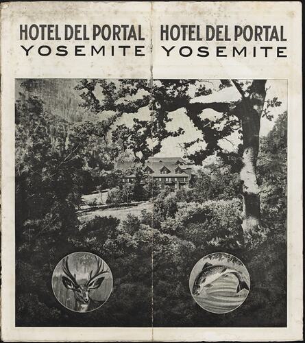 'Hotel Del Portal, Yosemite' is a booklet issued in 1911 by the Hotel Del Portal, the 'Gateway' to Yosemite National Park in California, U.S.A. The booklet provides travel information about Yosemite National Park as well as information about the hotel itself, advertised as 'A place of Quite Beauty for Rest Seekers, Nature Lovers and Sportsmen'.