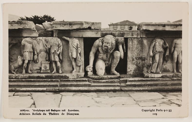 Printed on the front of the photograph; 'Athenes. Reliefs du Theatre de Dionysos' / Copyright Perla Athenes 9-1-33 / 121' Printed on the back of the photograph; 'LEONAR 18'