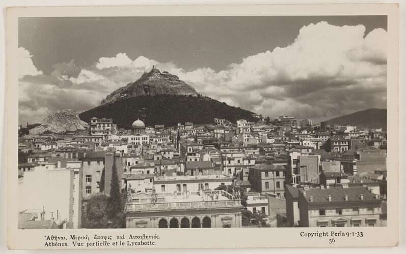 Printed on the front of the photograph; 'Athenes. Vue partielle et le Lycabette. / Copyright Perla Athenes 9-1-33 / 56' Printed on the back of the photograph; 'POST CARD / CARTE POSTALE'