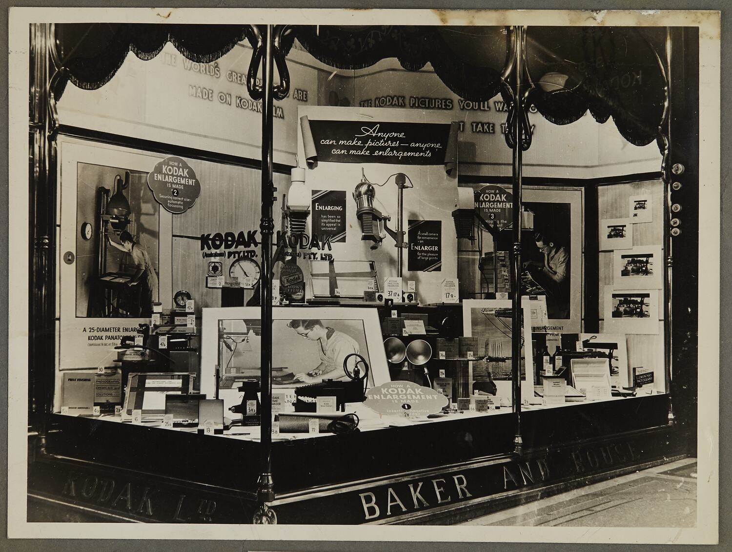 Shopfront display of 'How a Kodak Enlargement is Made' showing cameras, photographs, photographic accessories and equipment.