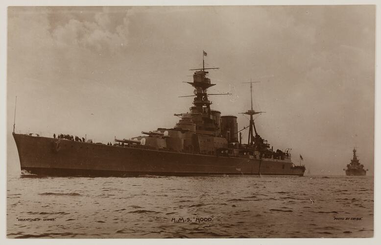 Printed on the front of the photograph; ''VALENTINE'S SERIES' H.M.S. HOOD 'PHOTO BY CRIBB.'' Printed on the back of the photograph; 'PRINTED IN BRITAIN / POST CARD / THIS SPACE FOR COMMUNICATION / THE ADDRESS TO BE WRITTEN HERE / H.M.S. 'HOOD' / BATTLE-CRUISER 41,200 TONS / LARGEST AND / HEAVIEST WARSHIP / AFLOAT. / The Valentine & Sons' Publishing Co., Ltd., / Melbourne and Sydney / THIS IS A REAL PHOTOGRAPH'
