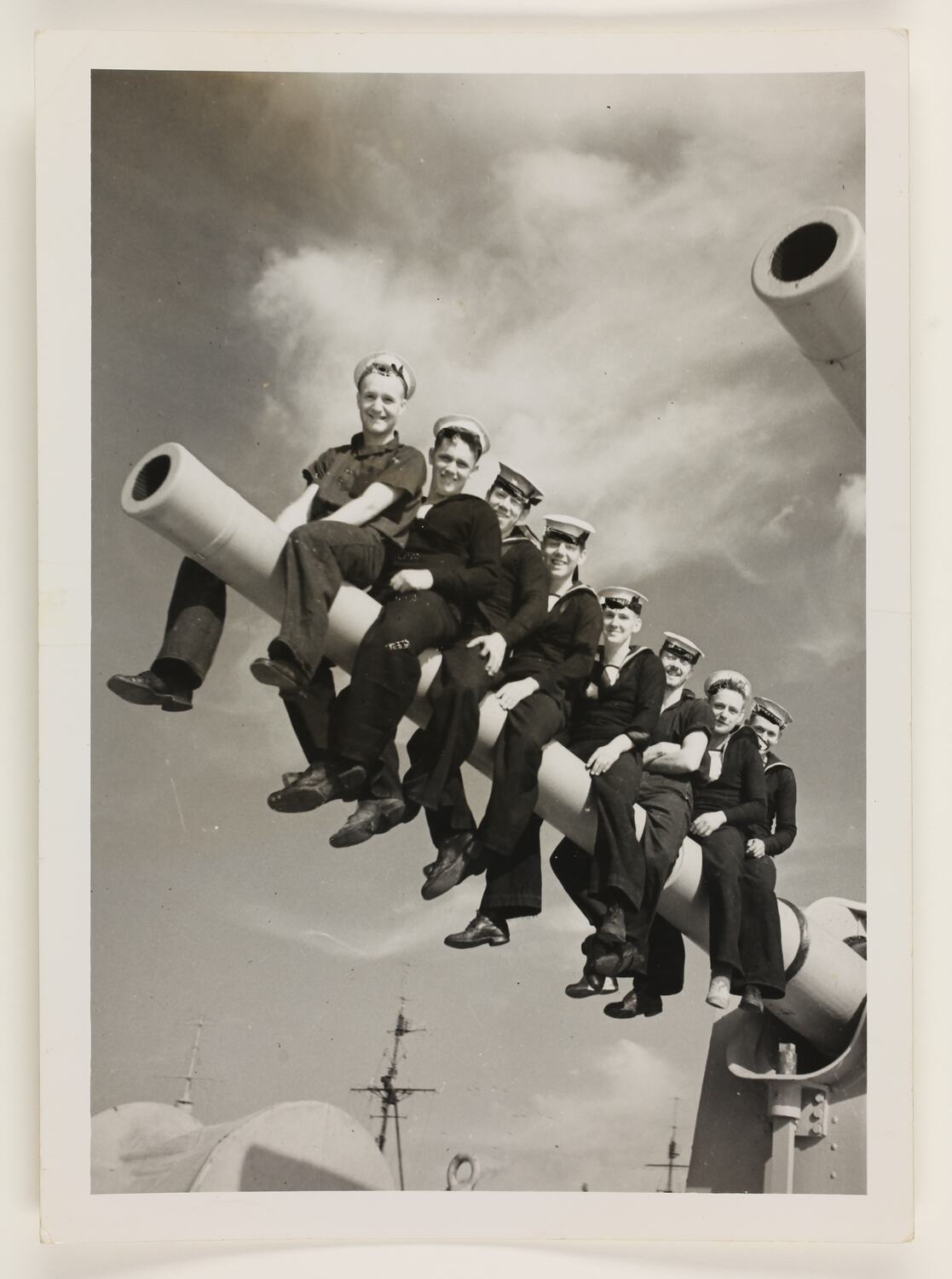 Portrait of eight seamen sitting on a naval gun during World War II.