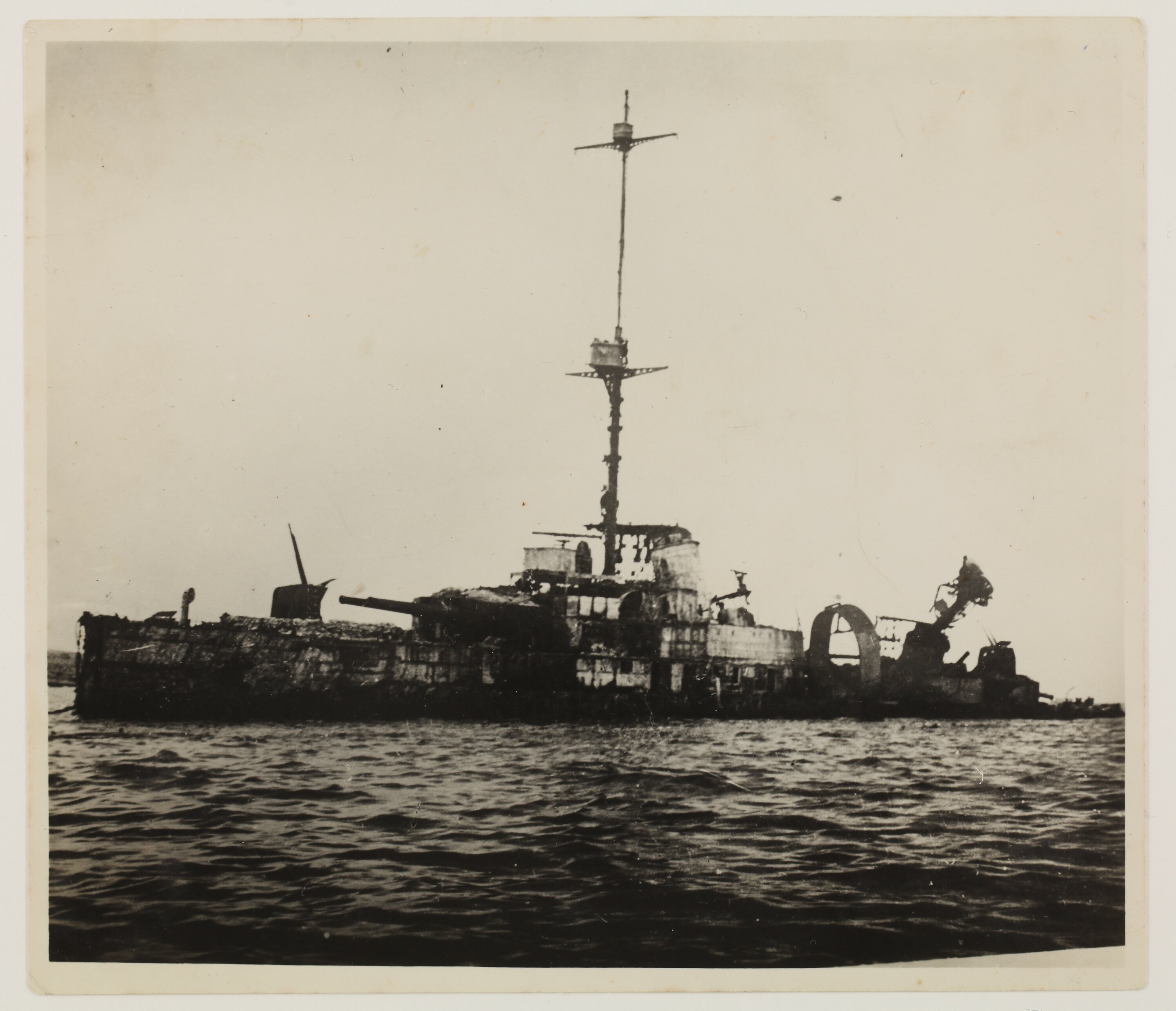 A destroyed battleship during World War II. One of 32 black and white photographs, some in the form of postcards, relating to the military service of David Ralph Goodwin, Ex H.M.A.S. Association (Vic).