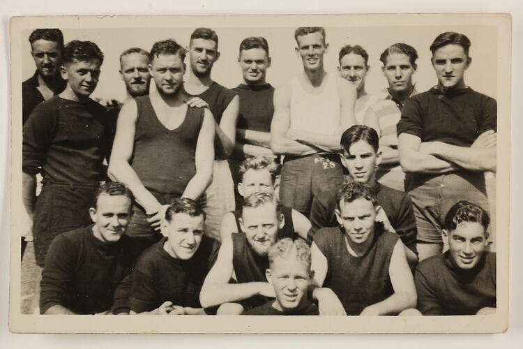 A group of men in casual clothing during World War II. One of 32 black and white photographs, some in the form of postcards, relating to the military service of David Ralph Goodwin, Ex H.M.A.S. Association (Vic).