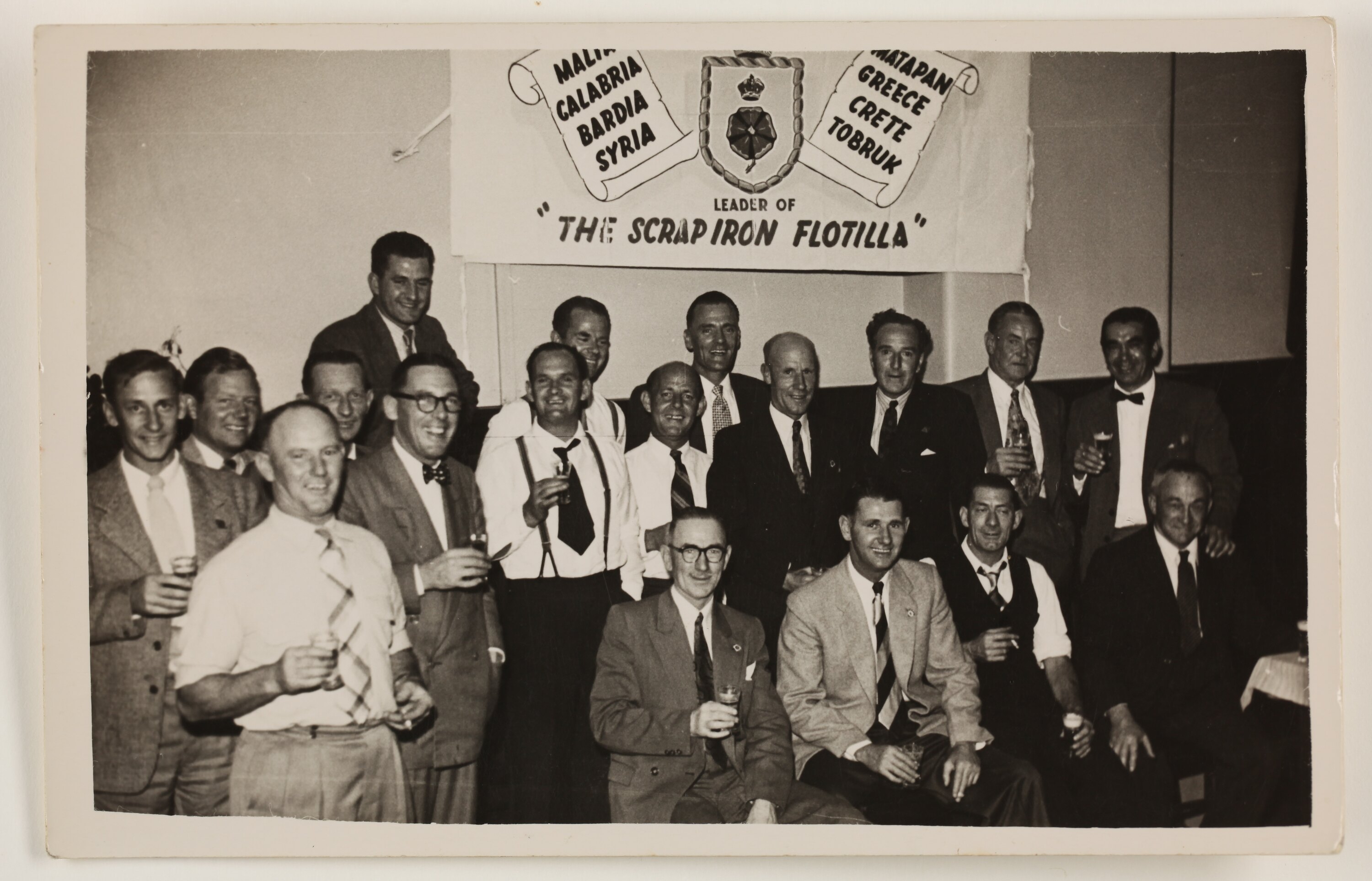 Portrait of eighteen men in suits. Behind them is a banner that reads; 'LEADER OF 'THE SCRAP IRON FLOTILLA' CALABRIA BARDIA SYRIA MATAPAN GREECE CRETE TOBRUK', taken during World War II.