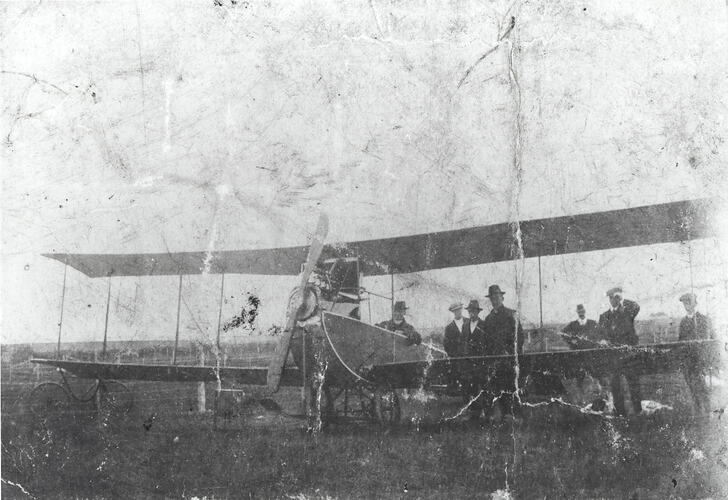 Hans Christian Andersen seated in the cockpit of an Avro-Type Biplane built by John Robertson Duigan at Ivanhoe, Victoria, in 1912-1913. The plane is fitted with both landing skids and pnuematic-tyrred wire-spoked wheels. A group of six men are standing behind the plane. The photograph was probably taken at Belmont Common, Geelong, from where Andersen made several flights with the plane in 1915-1916.