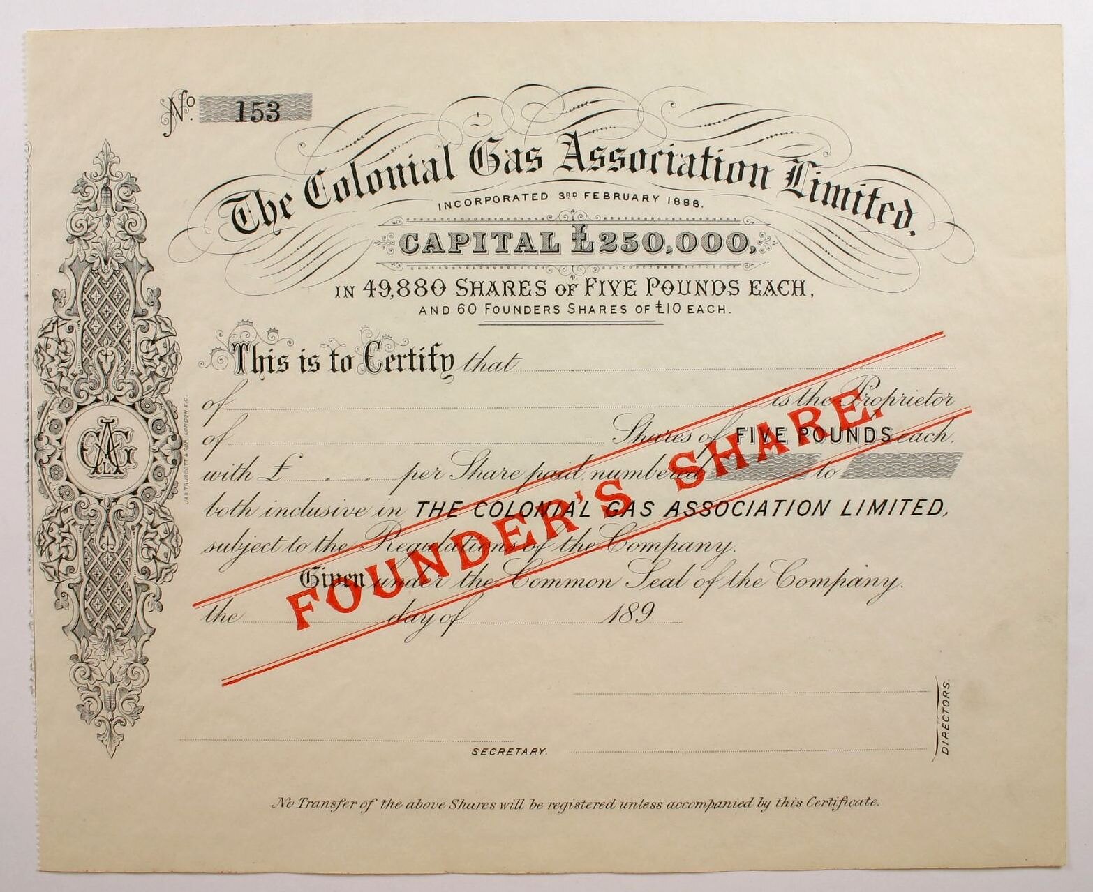 Text: No. 153/ The Colonial Gas Association Limited,/ INCORPORATED 3RD FEBRUARY 1888./ CAPITAL L250,000,/ IN 49,880 SHARES OF FIVE POUNDS EACH,/ AND 60 FOUNDERS SHARES OF L10 EACH./ This is to Certify that.../ of... is the Proprietor/ of...Share of FIVE POUND each, with L...,...,...per Share paid numbered...to.../ both inclusive in THE COLONIAL GAS ASSOCIATION LIMITED,/ subject to the Regulations of the Company./ Given under the Common Seal of the Company/ the...day of...189.../ ...SECRETARY./ ...DIRECTORS./ No Transfer of the above Shares will be registered unless accompanied by this Certificate.