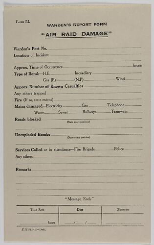 A printed form intended for use for recording damage incurred as a result of an air raid during World War II. It has not been filled out.