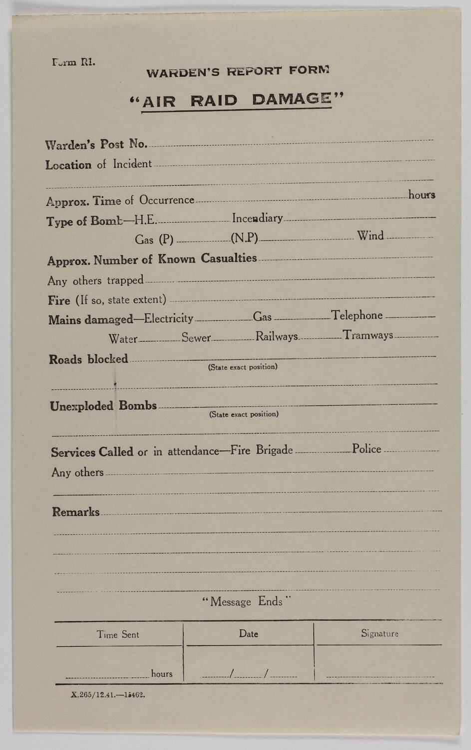 At the top: "Form R1. / WARDEN'S REPORT FORM / "AIR RAID DAMAGE" " At the bottom: " X.265/12.41.-15462 "