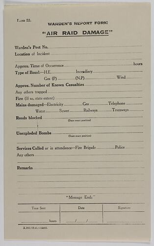 A printed form intended for use for recording damage incurred as a result of an air raid during World War II. It has not been filled out.