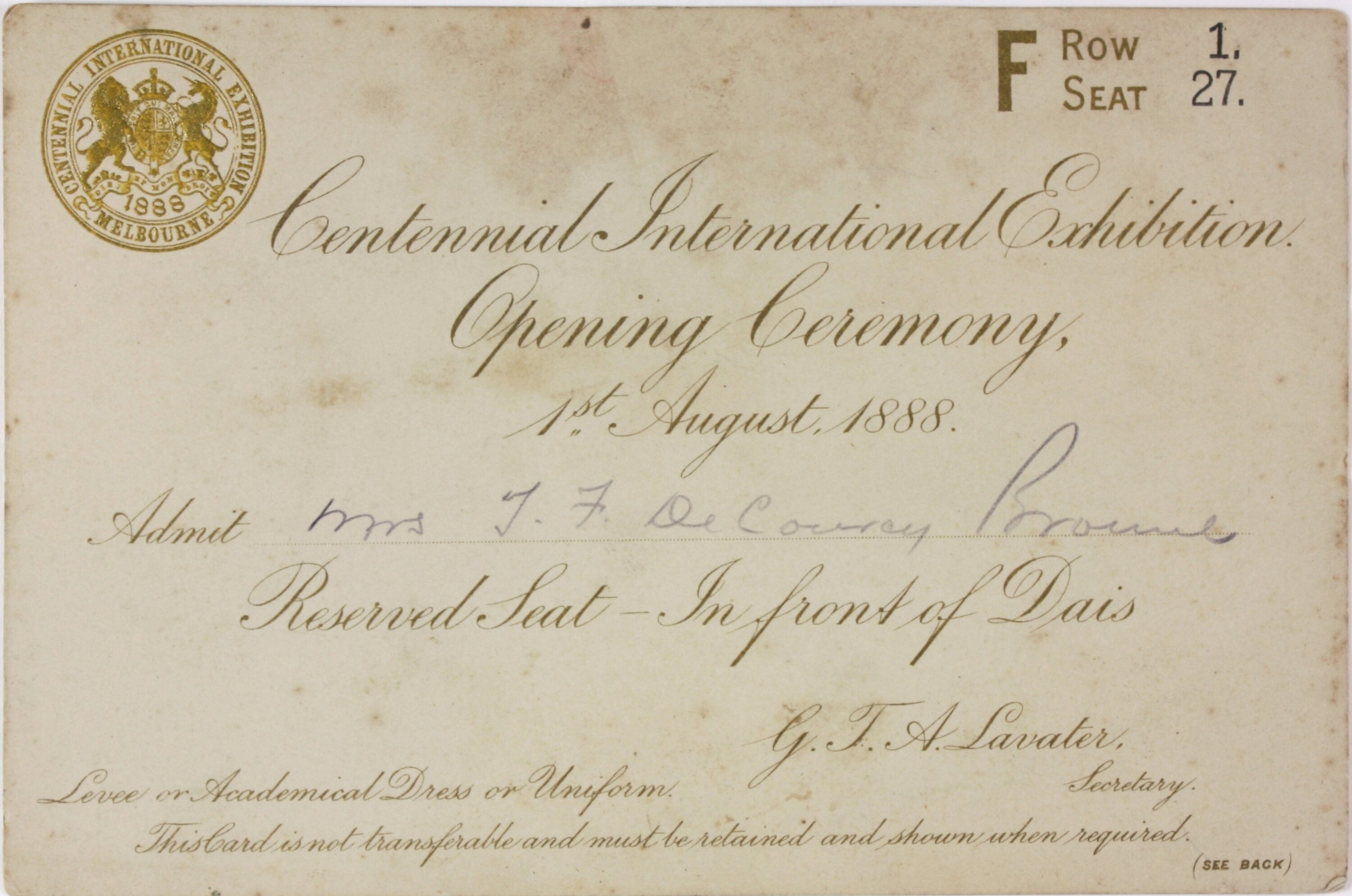 Text on obverse: F ROW 1/ SEAT 27; Centennial International Exhibition./ Opening Ceremony,/ 1st August 1888./ Admit Mrs T. F. De Courcy Browne/ Reserved Seat - In front of Dais/ G. T. A. Lavater,/ Secretary./ Levee or Academical Dress of Uniform./ This Card is not transferable and must be retained and shown when required./ (SEE BACK) Text on reverse, underneath floor plan: The Holder of this Ticket must enter by the Rathdowne Street Door, and be in/ the building before 11.30, at which hour the doors will be absolutely closed. The/ Colored Portion of the Plan shows the position of the Seats.