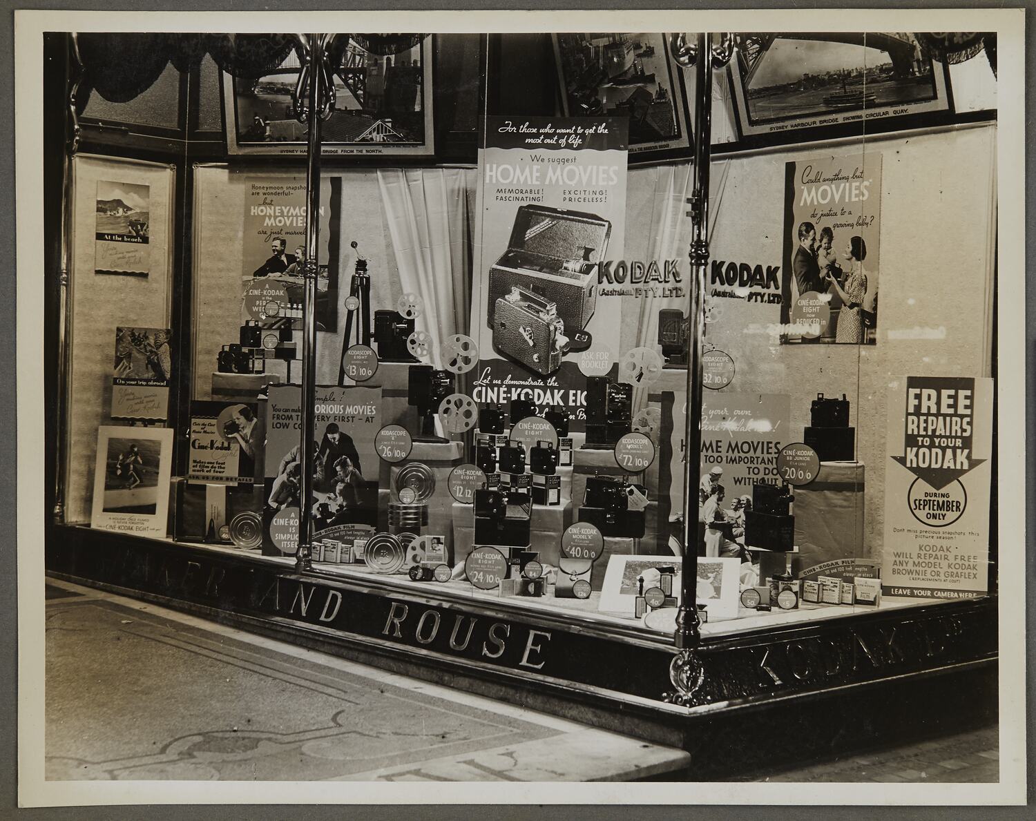 One of fifty-six photographs in an album depicting Kodak Australasia Pty Ltd shop front window displays from the mid-1930s. Windows generally featured product promotions for film or cameras, as well as photographic exhibitions to attract crowds to the store. Exhibitions featured Mt Everest, the British Royal family, Australian farming, and images from famous photographers, for example Frank Hurley.