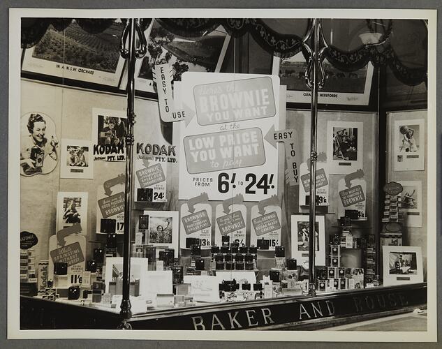 Shopfront display 'Here's the Brownie You Want' showing cameras, photographs, photographic accessories and equipment.