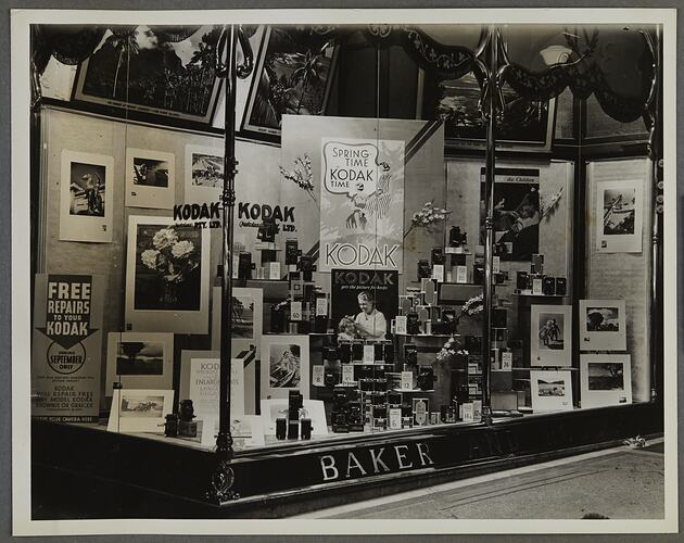 Shopfront display 'Spring Time is Kodak Time' showing cameras, photographs, photographic accessories and equipment.