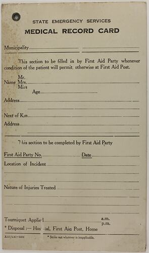 Printed card on which details of first aid treatment for patients in the event of an air raid are recorded. It is intended to be filled in by a First Aid Party whenever the condition of the patient will permit; otherwise it is to be filled in at a First Aid Post.