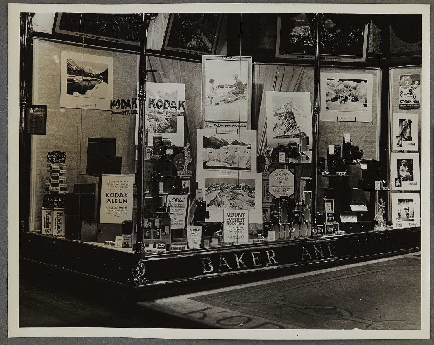One of fifty-six photographs in an album depicting Kodak Australasia Pty Ltd shop front window displays from the mid-1930s. Windows generally featured product promotions for film or cameras, as well as photographic exhibitions to attract crowds to the store. Exhibitions featured Mt Everest, the British Royal family, Australian farming, and images from famous photographers, for example Frank Hurley.