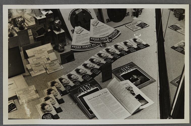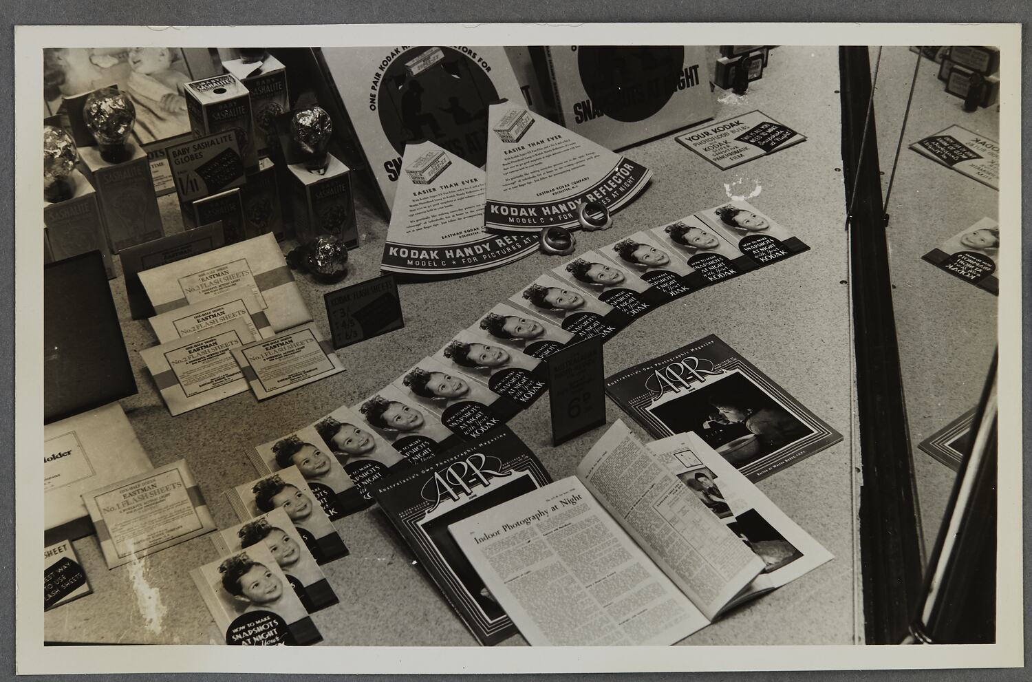 One of fifty-six photographs in an album depicting Kodak Australasia Pty Ltd shop front window displays from the mid-1930s. Windows generally featured product promotions for film or cameras, as well as photographic exhibitions to attract crowds to the store. Exhibitions featured Mt Everest, the British Royal family, Australian farming, and images from famous photographers, for example Frank Hurley.