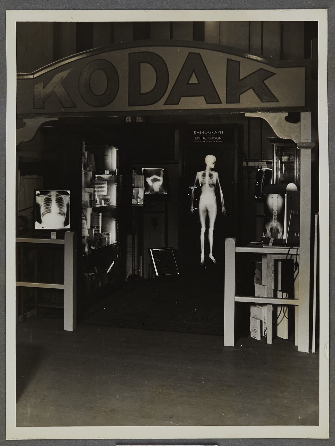 Shopfront display 'Radiography of a Living Person' showing cameras, photographs, photographic accessories and equipment.