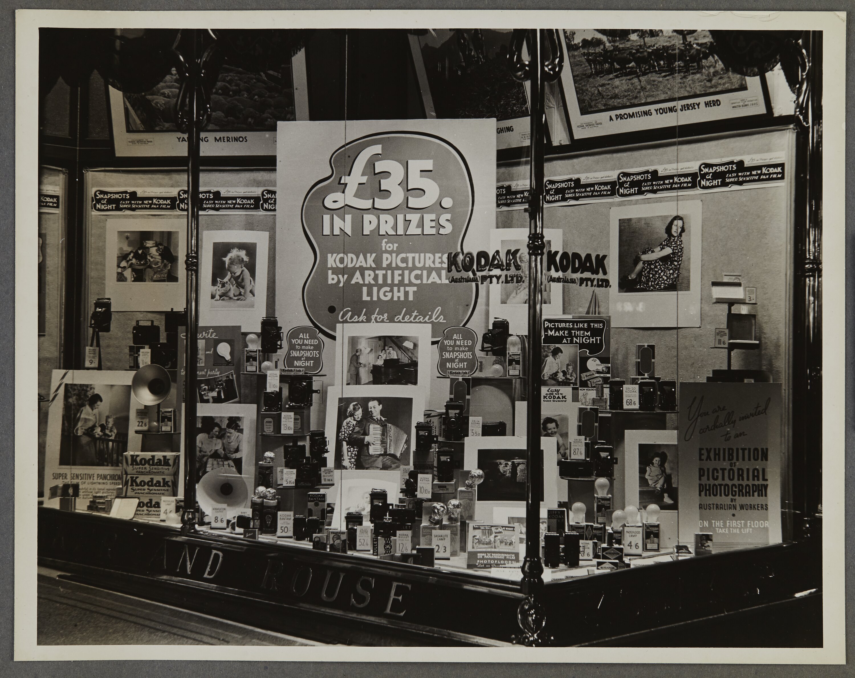One of fifty-six photographs in an album depicting Kodak Australasia Pty Ltd shop front window displays from the mid-1930s. Windows generally featured product promotions for film or cameras, as well as photographic exhibitions to attract crowds to the store. Exhibitions featured Mt Everest, the British Royal family, Australian farming, and images from famous photographers, for example Frank Hurley.