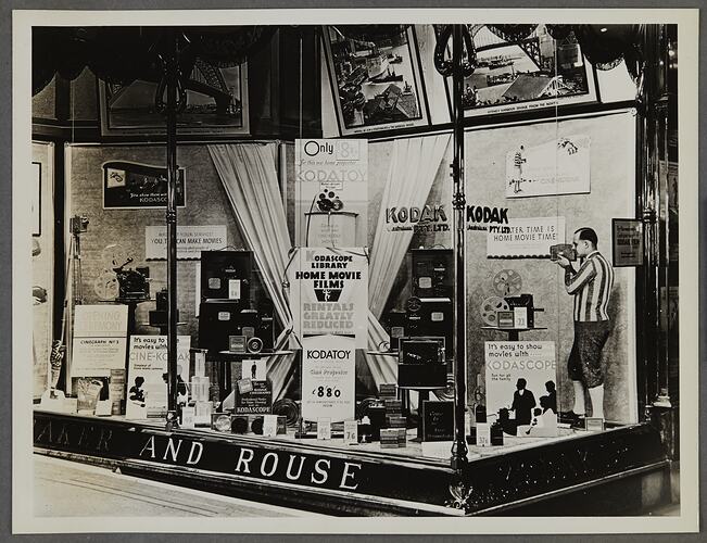 Shopfront display 'Kodascope Library Home Movie Films' showing cameras, photographs, photographic accessories and equipment.