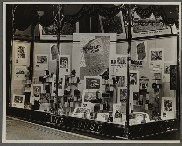 One of fifty-six photographs in an album depicting Kodak Australasia Pty Ltd shop front window displays from the mid-1930s. Windows generally featured product promotions for film or cameras, as well as photographic exhibitions to attract crowds to the store. Exhibitions featured Mt Everest, the British Royal family, Australian farming, and images from famous photographers, for example Frank Hurley.