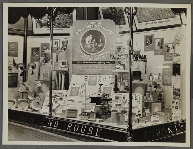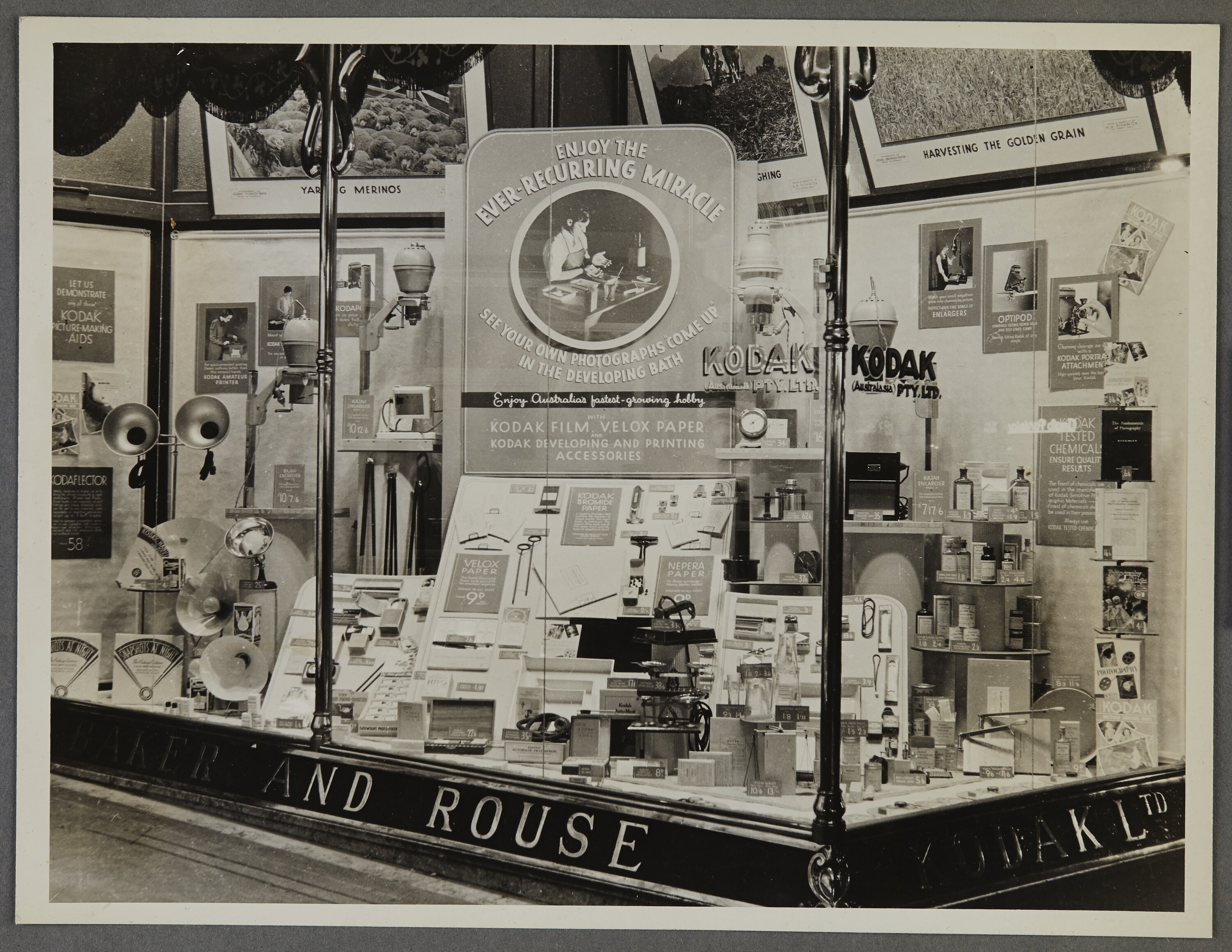 One of fifty-six photographs in an album depicting Kodak Australasia Pty Ltd shop front window displays from the mid-1930s. Windows generally featured product promotions for film or cameras, as well as photographic exhibitions to attract crowds to the store. Exhibitions featured Mt Everest, the British Royal family, Australian farming, and images from famous photographers, for example Frank Hurley.