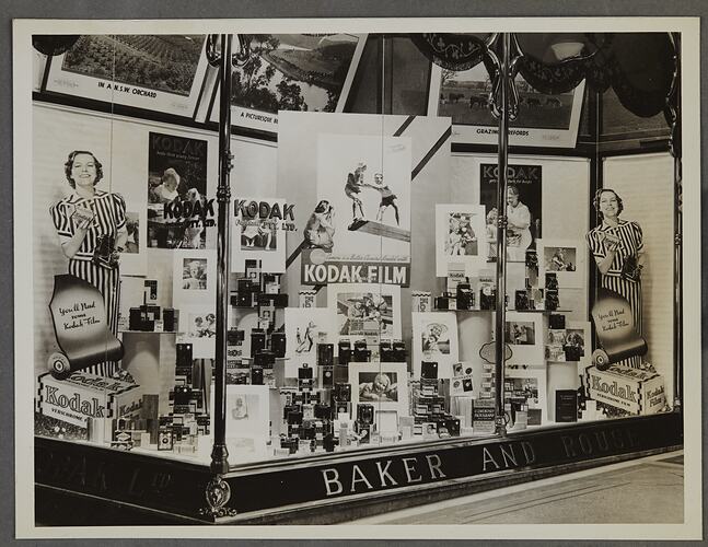 One of fifty-six photographs in an album depicting Kodak Australasia Pty Ltd shop front window displays from the mid-1930s. Windows generally featured product promotions for film or cameras, as well as photographic exhibitions to attract crowds to the store. Exhibitions featured Mt Everest, the British Royal family, Australian farming, and images from famous photographers, for example Frank Hurley.