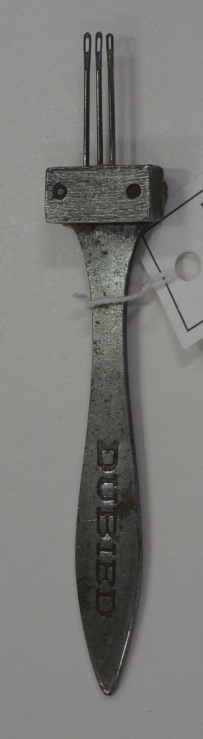 Transfer tool consists of three needles attached to a metal handle, with the eyelet end of the needles pointing out. The needles are attached to the handle by a small rectangular plate with two screws. The handle is a flat, elongated oval shape. There are some signs of rust and corrosion.