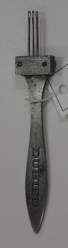 Transfer Tool used with 'Dubied' knitting machine, used by Edda Azzola from 1950 to 2000 for making commercial and personal clothing. This 'Dubied' knitting machine was brought to Australia from Italy in the 1950s by an Italian migrant woman and then sold to the Edda, who had migrated to Melbourne from Italy in 1955. Edda used it to supply a Collingwood knitting mill with finely finished clothes for sale to Melbourne department stores, until the factory closed in 1974. It was then used to make family clothes.