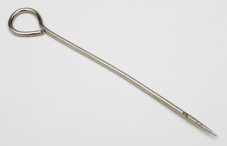Needle used with 'Dubied' knitting machine, used by Edda Azzola from 1950 to 2000 for making commercial and personal clothing. This 'Dubied' knitting machine was brought to Australia from Italy in the 1950s by an Italian migrant woman and then sold to the Edda, who had migrated to Melbourne from Italy in 1955. Edda used it to supply a Collingwood knitting mill with finely finished clothes for sale to Melbourne department stores, until the factory closed in 1974. It was then used to make family clothes.