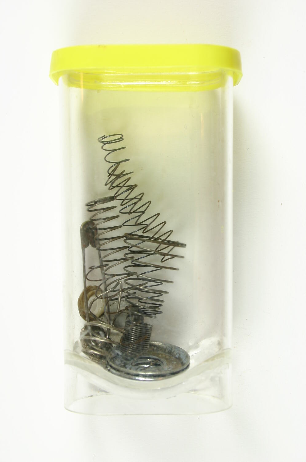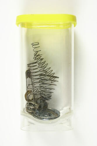 Springs and washers used with 'Dubied' knitting machine, used by Edda Azzola from 1950 to 2000 for making commercial and personal clothing. This 'Dubied' knitting machine was brought to Australia from Italy in the 1950s by an Italian migrant woman and then sold to the Edda, who had migrated to Melbourne from Italy in 1955. Edda used it to supply a Collingwood knitting mill with finely finished clothes for sale to Melbourne department stores, until the factory closed in 1974. It was then used to make family clothes.