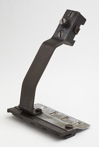 Presser Foot used with 'Dubied' knitting machine, used by Edda Azzola from 1950 to 2000 for making commercial and personal clothing. This 'Dubied' knitting machine was brought to Australia from Italy in the 1950s by an Italian migrant woman and then sold to the Edda, who had migrated to Melbourne from Italy in 1955. Edda used it to supply a Collingwood knitting mill with finely finished clothes for sale to Melbourne department stores, until the factory closed in 1974. It was then used to make family clothes.