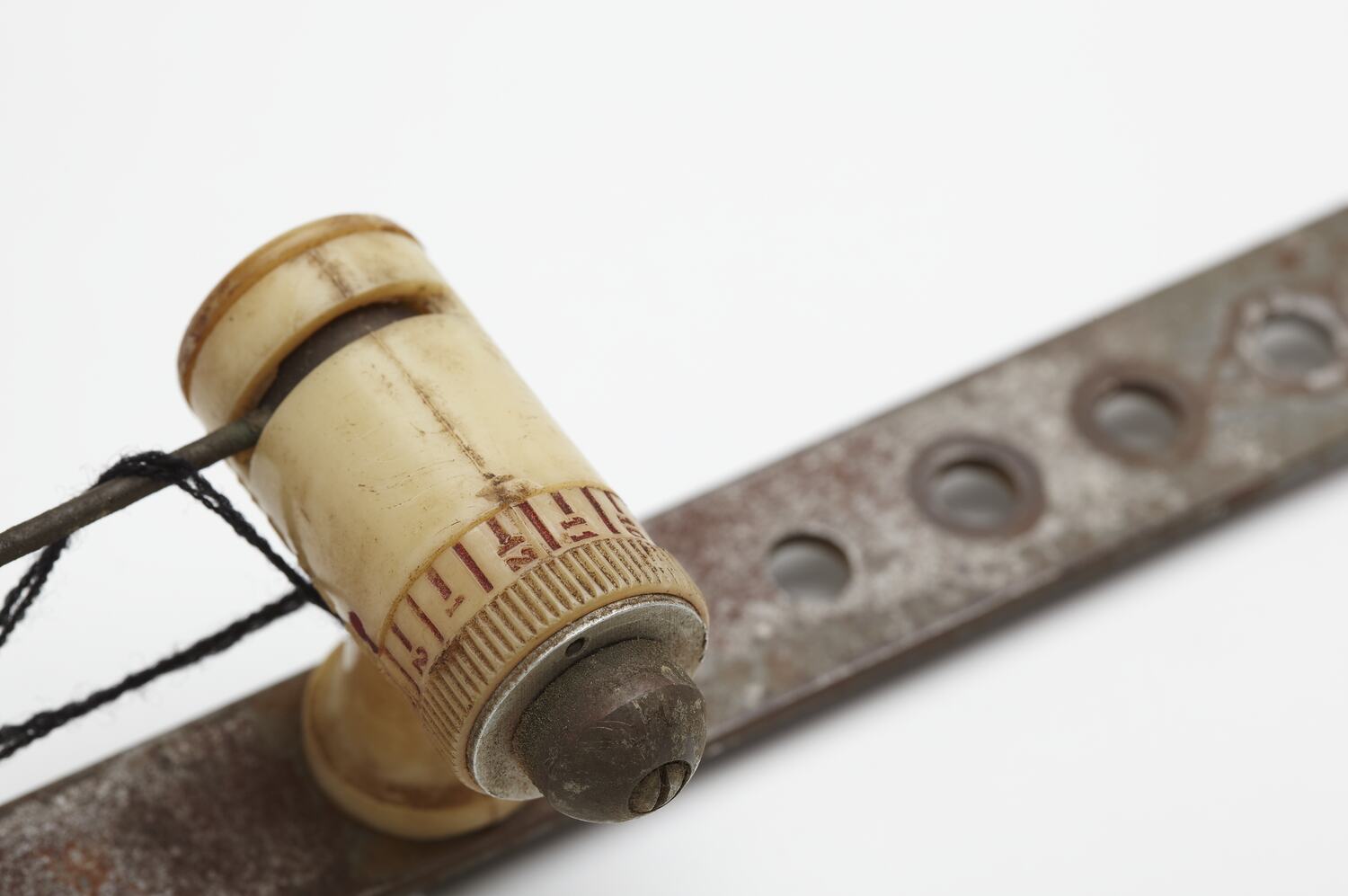 Thread feed tension arm. Made of a flat metal strip with holes punched at each end. There are two tension adjustments.