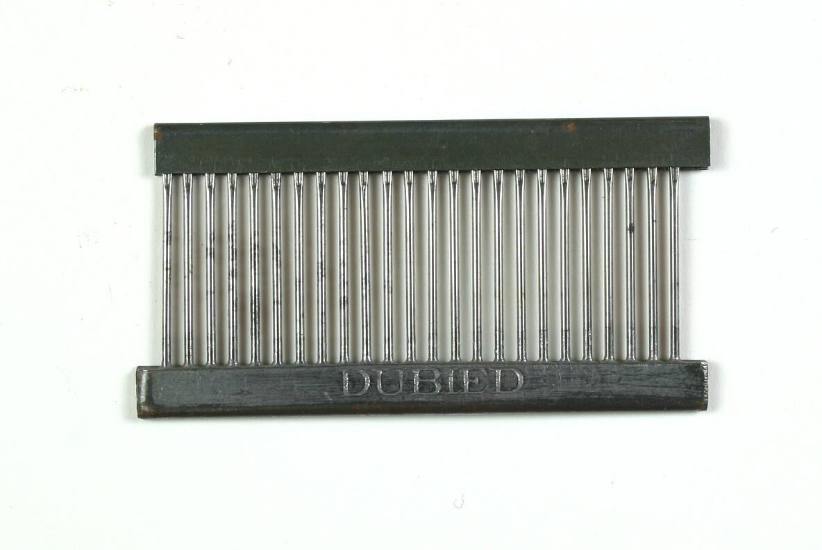 Part for the 'Dubied' knitting machine, used by Edda Azzola from 1950 to 2000 for making commercial and personal clothing. This 'Dubied' knitting machine was brought to Australia from Italy in the 1950s by an Italian migrant woman and then sold to the Edda, who had migrated to Melbourne from Italy in 1955. Edda used it to supply a Collingwood knitting mill with finely finished clothes for sale to Melbourne department stores, until the factory closed in 1974. It was then used to make family clothes.