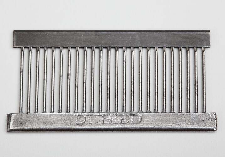 Part for the 'Dubied' knitting machine, used by Edda Azzola from 1950 to 2000 for making commercial and personal clothing. This 'Dubied' knitting machine was brought to Australia from Italy in the 1950s by an Italian migrant woman and then sold to the Edda, who had migrated to Melbourne from Italy in 1955. Edda used it to supply a Collingwood knitting mill with finely finished clothes for sale to Melbourne department stores, until the factory closed in 1974. It was then used to make family clothes.