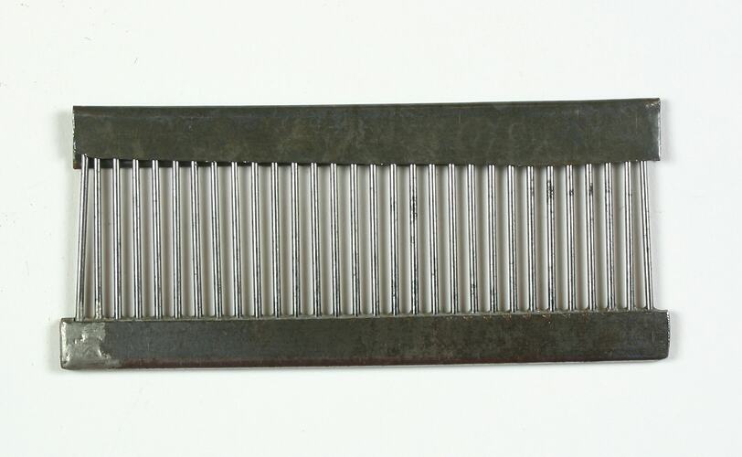 Part for the 'Dubied' knitting machine, used by Edda Azzola from 1950 to 2000 for making commercial and personal clothing. This 'Dubied' knitting machine was brought to Australia from Italy in the 1950s by an Italian migrant woman and then sold to the Edda, who had migrated to Melbourne from Italy in 1955. Edda used it to supply a Collingwood knitting mill with finely finished clothes for sale to Melbourne department stores, until the factory closed in 1974. It was then used to make family clothes.
