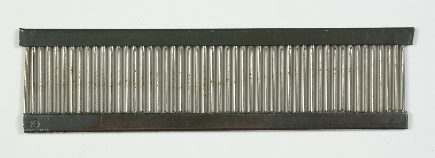 Part for the 'Dubied' knitting machine, used by Edda Azzola from 1950 to 2000 for making commercial and personal clothing. This 'Dubied' knitting machine was brought to Australia from Italy in the 1950s by an Italian migrant woman and then sold to the Edda, who had migrated to Melbourne from Italy in 1955. Edda used it to supply a Collingwood knitting mill with finely finished clothes for sale to Melbourne department stores, until the factory closed in 1974. It was then used to make family clothes.