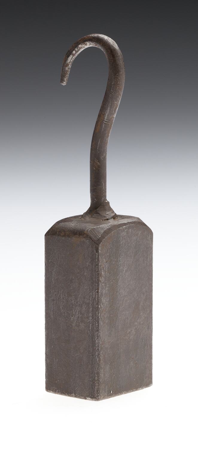 Metal rectangular shaped weight with a hooked end.