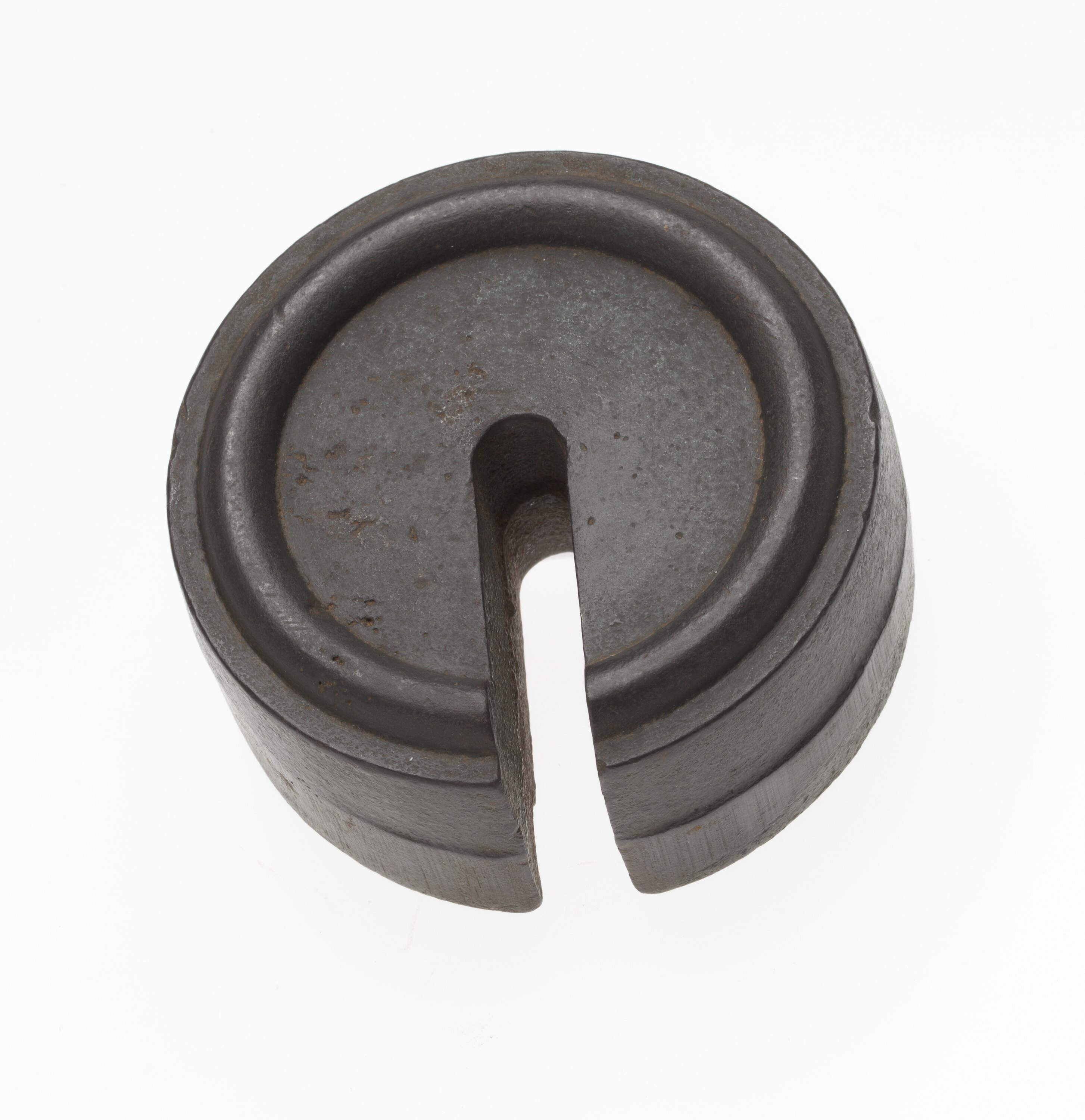 Weight used with 'Dubied' knitting machine, used by Edda Azzola from 1950 to 2000 for making commercial and personal clothing. This 'Dubied' knitting machine was brought to Australia from Italy in the 1950s by an Italian migrant woman and then sold to the Edda, who had migrated to Melbourne from Italy in 1955. Edda used it to supply a Collingwood knitting mill with finely finished clothes for sale to Melbourne department stores, until the factory closed in 1974. It was then used to make family clothes.