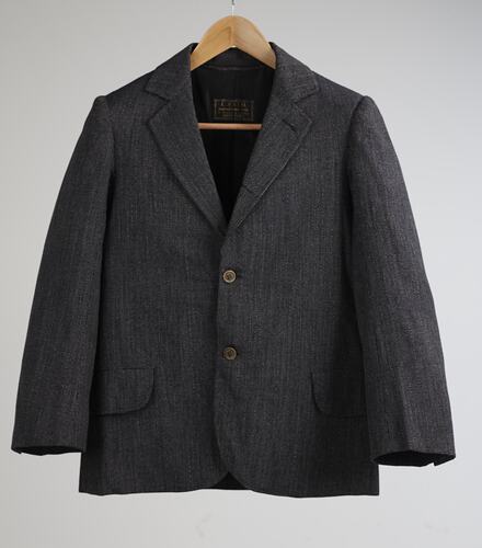 Black and white woollen suit jacket made by Ichizo Sato, a Japanese tailor in South Yarra, Melbourne, circa 1910 and worn by Japanese immigrant Setsutaro Hasegawa.