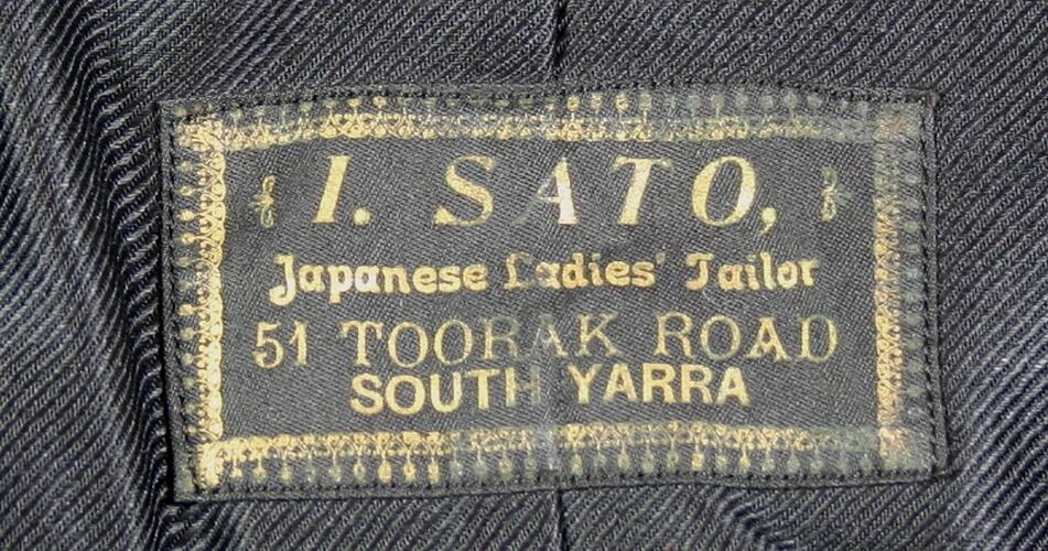 Label: 'I. Sato. Japanese Ladies Tailor: 51 Toorak Rd: South Yarra'.