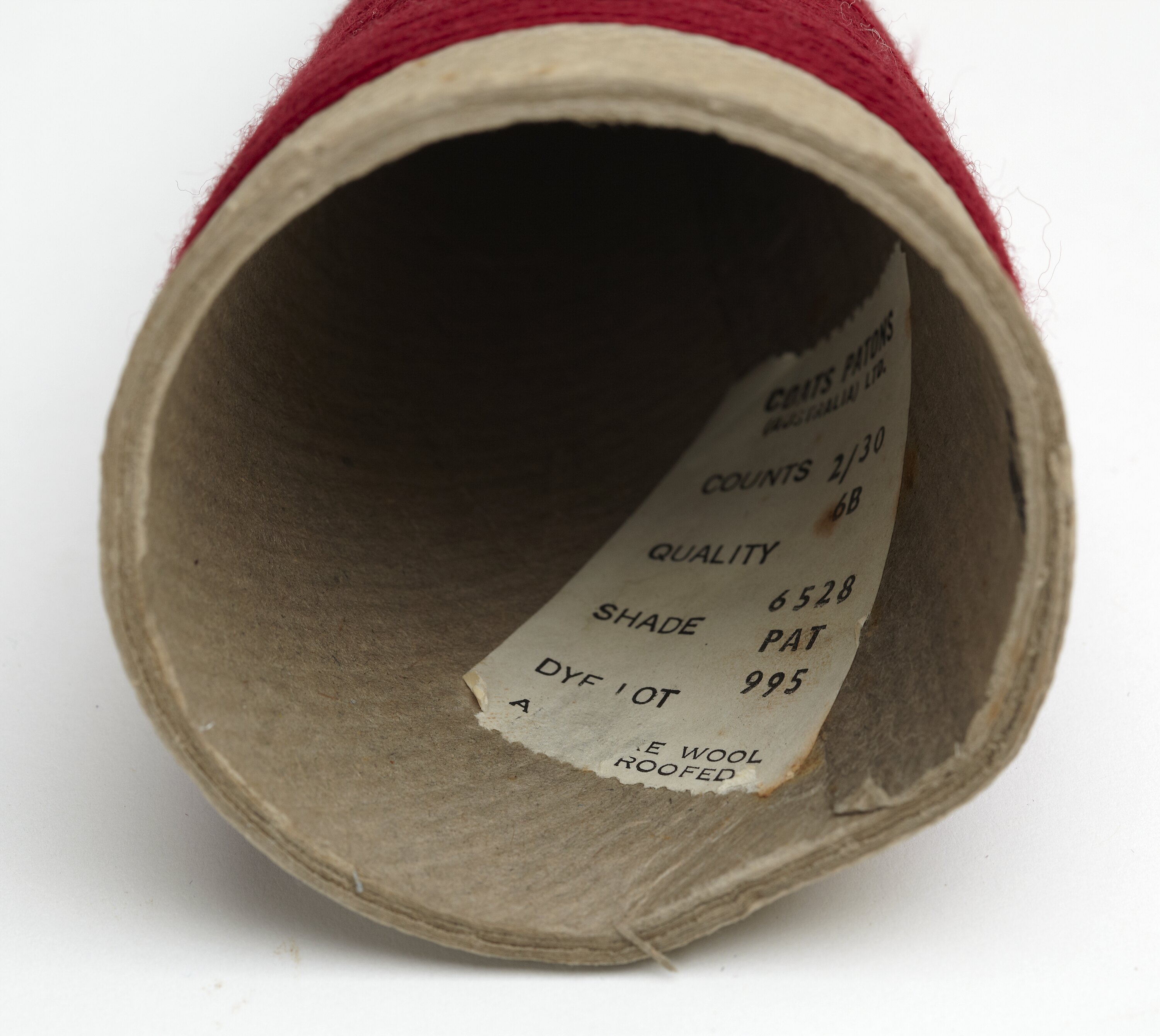 Cone of Thread used with 'Dubied' knitting machine, used by Edda Azzola from 1950 to 2000 for making commercial and personal clothing. This 'Dubied' knitting machine was brought to Australia from Italy in the 1950s by an Italian migrant woman and then sold to the Edda, who had migrated to Melbourne from Italy in 1955. Edda used it to supply a Collingwood knitting mill with finely finished clothes for sale to Melbourne department stores, until the factory closed in 1974. It was then used to make family clothes.