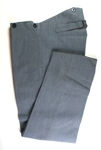 Woven dark and light grey striped trousers. The trousers close on the front with five black plastic buttons. There are two front pockets and four black plastic buttons on the front waistband and two buttons on the back waistband to attach braces. The trousers have a woven dark and light grey striped wool adjuster on the back, which is fastened with a black metal buckle. The pockets are lined with beige calico, the waistline and gusset are lined with white cotton striped material and the adjuster is lined with grey wool.