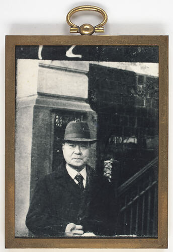 Photograph of Japanese immigrant Setsutaro Hasegawa taken from waist up. Setsutaro is dressed in a suit and a hat. The image was probably taken in Geelong in Victoria between 1945 and 1952.