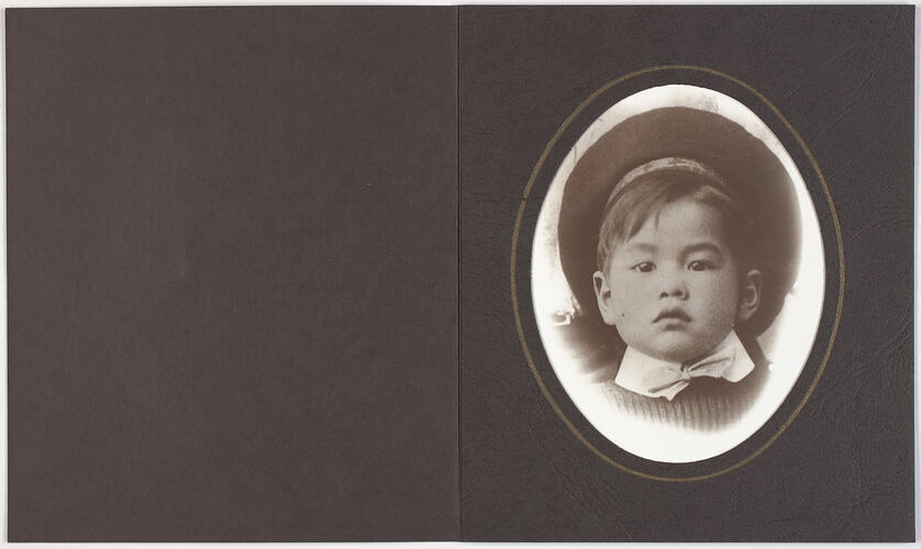 Digital portrait photograph of Moto Kozo Hasegawa, younger brother of Leo Takeshi Hasegawa taken as a child, circa 1910. Moto was later known to many as Jack and then Jack Cole. It would have been taken in either Geelong or Ballarat. Leo (Leonard Takeshi) Hasegawa was born in 1906 in Geelong. The son of Japanese migrant Setsutaro Hasegawa, who arrived in Australia in 1897, and Australian-born Ada Cole. Leo married Edna Ida Gladys Jorgensen in 1929.